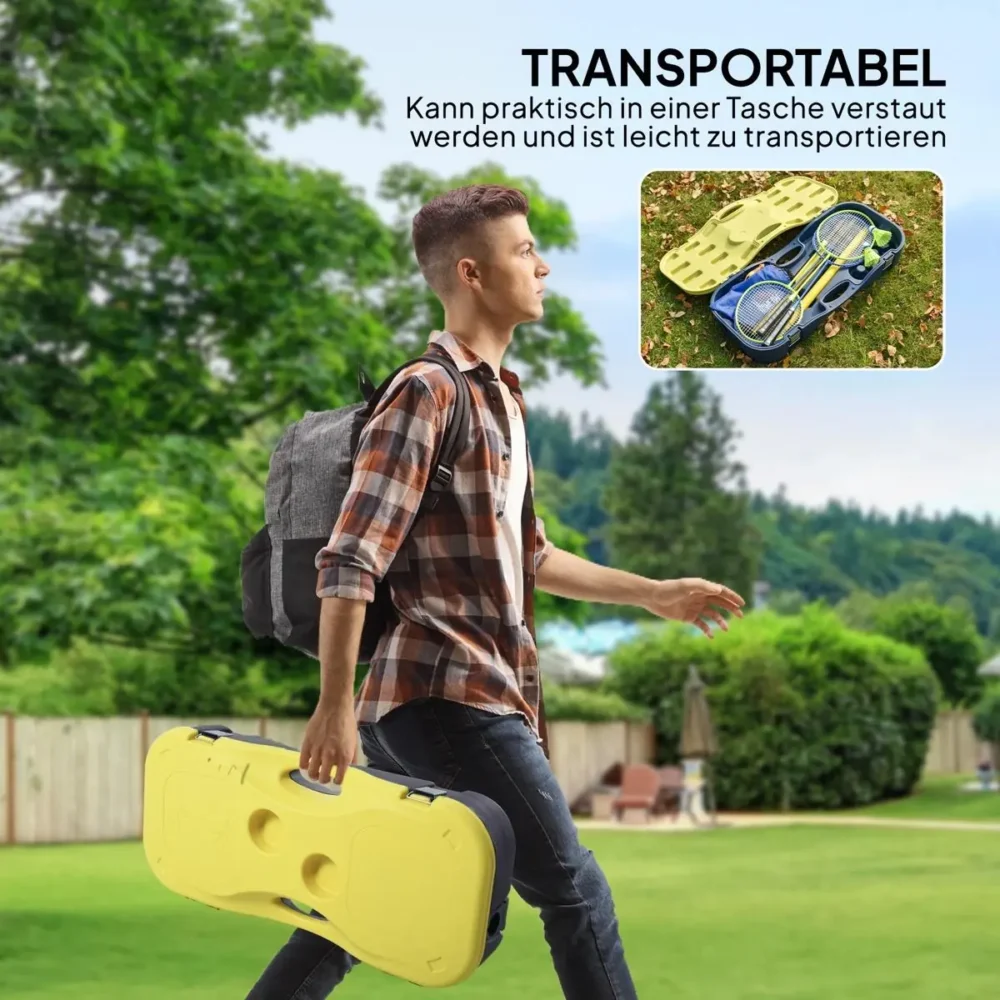 Maximera sommarens utomhusaktiviteter med detta kompletta och bärbara badmintonset. Oavsett om du planerar en dag på stranden, en picknick i parken eller en spännande match i trädgården, erbjuder detta set en stabil och hållbar lösning för sportig underhållning. Det smarta allt-i-ett-systemet gör att du slipper krångel med lösa delar, då väskan fungerar som en organiserad bas för hela utrustningen.