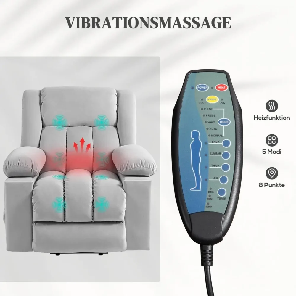 - Massagesystem med värme: Utrustad med 8 vibrationsmotorer som bearbetar rygg, ländrygg, lår och ben samt ländryggsvärme för ökad cirkulation.