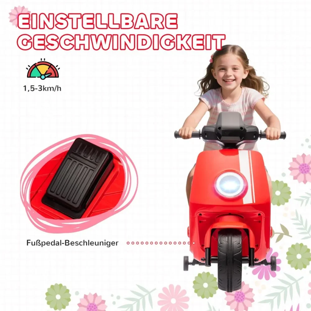 Låt ditt barn uppleva friheten på hjul med denna sportiga 6V elmotorcykel. Denna elmotorcykel i en livlig röd färg är specifikt utformad för små äventyrare mellan 18 och 36 månader. Genom att kombinera säkerhetsdetaljer som avtagbara stödhjul med roliga funktioner som belysning och musik, blir den snabbt en favorit i leksaksparken.