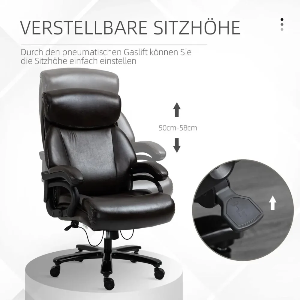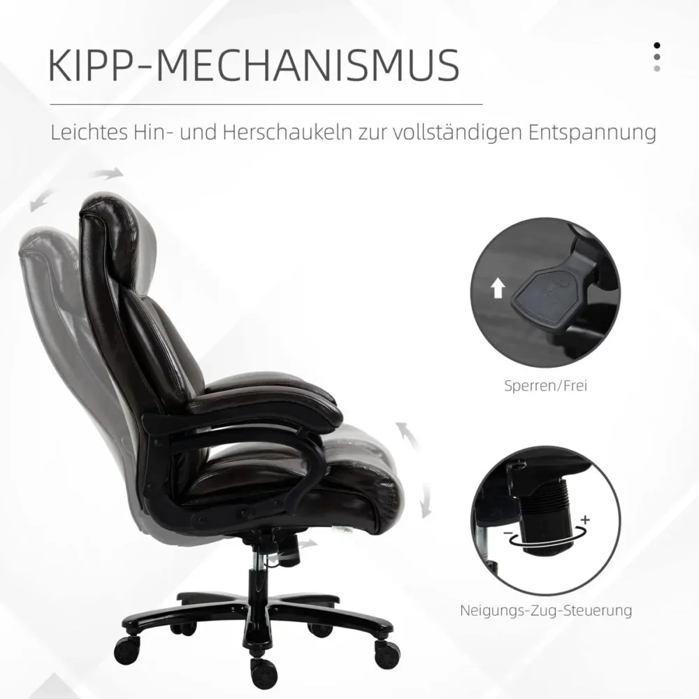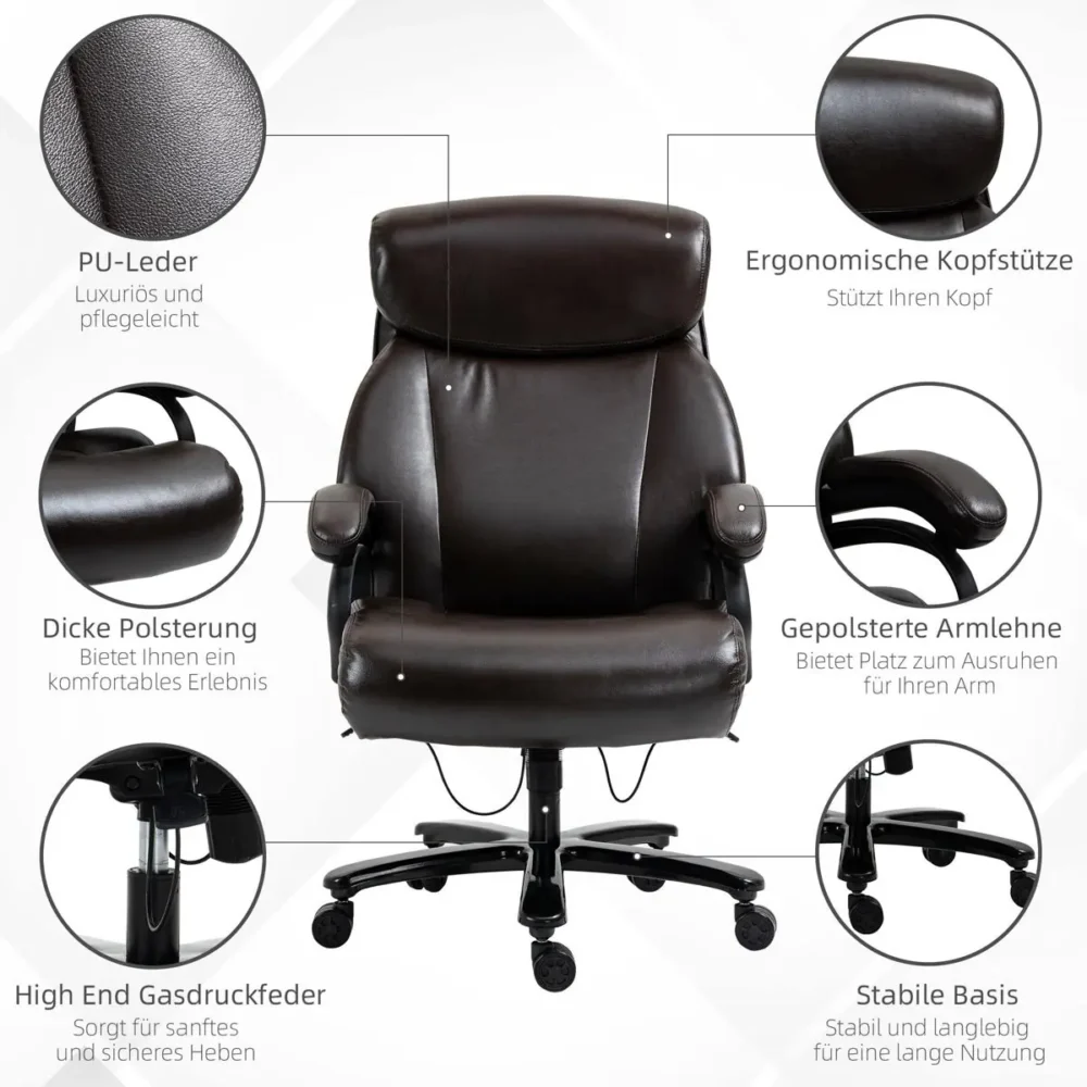 Uppgradera ditt hemmakontor med en chefstol som kombinerar lyxig estetik med kompromisslös ergonomi. Denna bruna kontorsstol i högkvalitativt konstläder är designad för dig som kräver både stil och substans. Med en robust konstruktion som stödjer upp till 180 kg och en generös vaddering är detta det perfekta valet för professionell användning och långa arbetspass framför datorn.