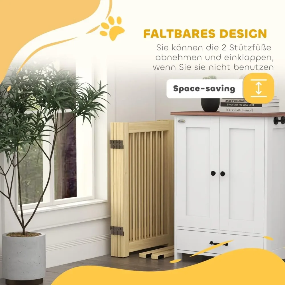 Skapa en trygg och säker miljö för din fyrbenta vän med denna eleganta fristående hundgrind. Tillverkad i massiv furu erbjuder den en robust konstruktion som smälter in naturligt i de flesta inredningsstilar. Tack vare sin flexibla design med fyra paneler kan du enkelt anpassa grinden efter ditt hems unika behov, oavsett om det gäller att spärra av en trappa, en korridor eller dela av ett större rum.