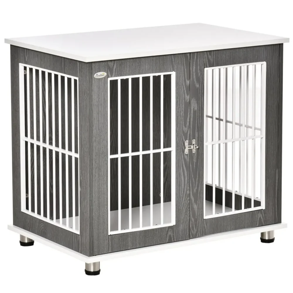 Ge din hund en trygg och stilren plats i hemmet med denna moderna hundbur. Denna kombination av hundkoja och möbel är designad för att smälta in i din inredning samtidigt som den erbjuder en säker miljö för små till medelstora hundar. Med sin robusta konstruktion i högkvalitativt trämaterial och stål är detta en hållbar lösning för både vila och kortvarig transport.