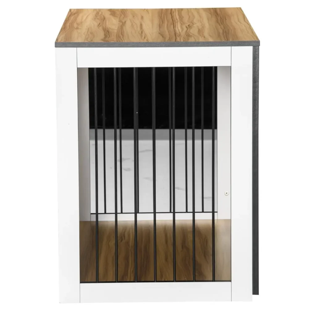 Ge din hund en trygg och stilfull viloplats med denna moderna hundbur i trä. Denna unika hundmöbel kombinerar funktionalitet med estetik, vilket gör att den smälter in perfekt i vardagsrummet som ett elegant sidobord eller en praktisk TV-bänk. Burens insida erbjuder en skyddad oas för sömn och återhämtning, samtidigt som den robusta ovansidan ger en stor avlastningsyta för dekorationer, böcker eller mediautrustning.