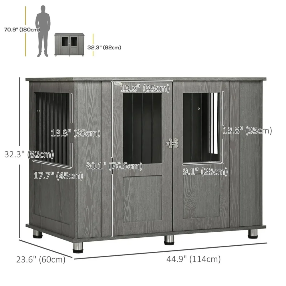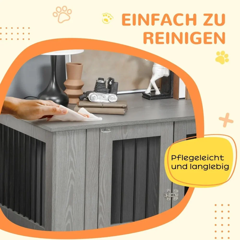 Bli först med att recensera ”Hundbur Inomhus Grå 116 cm – Elegant Hundbox & Sidobord för XL Hundar – 2 Dörrar med Lås”