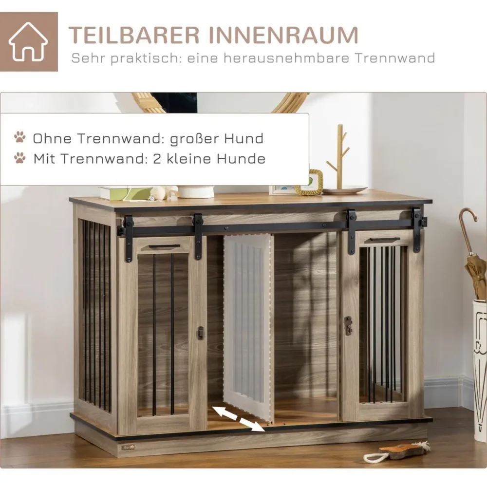 Ge din hund en trygg och stilfull viloplats med denna eleganta hundbur i rustik design. Denna mångsidiga hundbox fungerar inte bara som en säker plats för återhämtning, utan är även designad för att vara en vacker del av din heminredning. Tack vare den smarta 2-i-1-lösningen kan du enkelt växla mellan att ha ett stort gemensamt utrymme eller två separata rum, vilket gör den perfekt för hushåll med flera hundar.