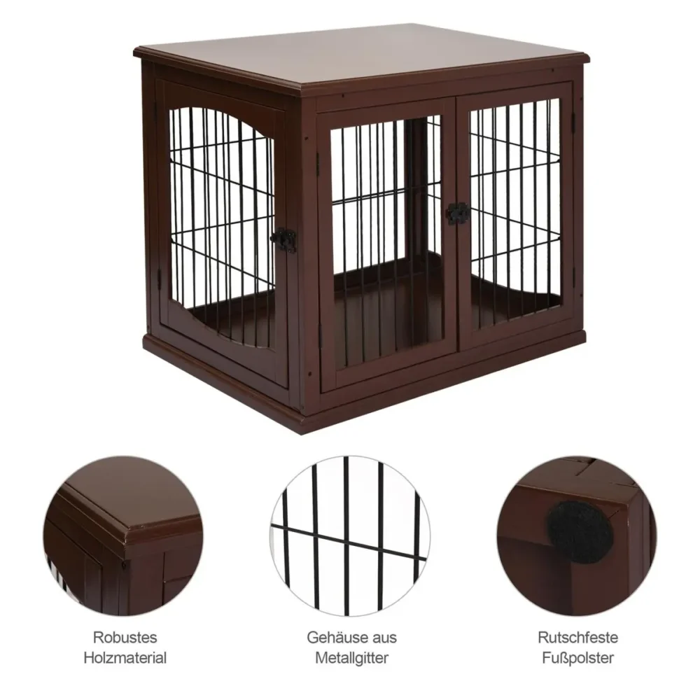 Upptäck den perfekta balansen mellan funktionalitet och stil med denna eleganta hundbur i möbeldesign. Istället för en traditionell trådbur får du här en inredningsdetalj som fungerar lika bra som ett snyggt sidobord bredvid soffan eller sängen. Den robusta konstruktionen erbjuder din fyrbenta vän en trygg och mysig viloplats, samtidigt som du kan använda ovansidan för lampor, dekorationsföremål eller fjärrkontroller.