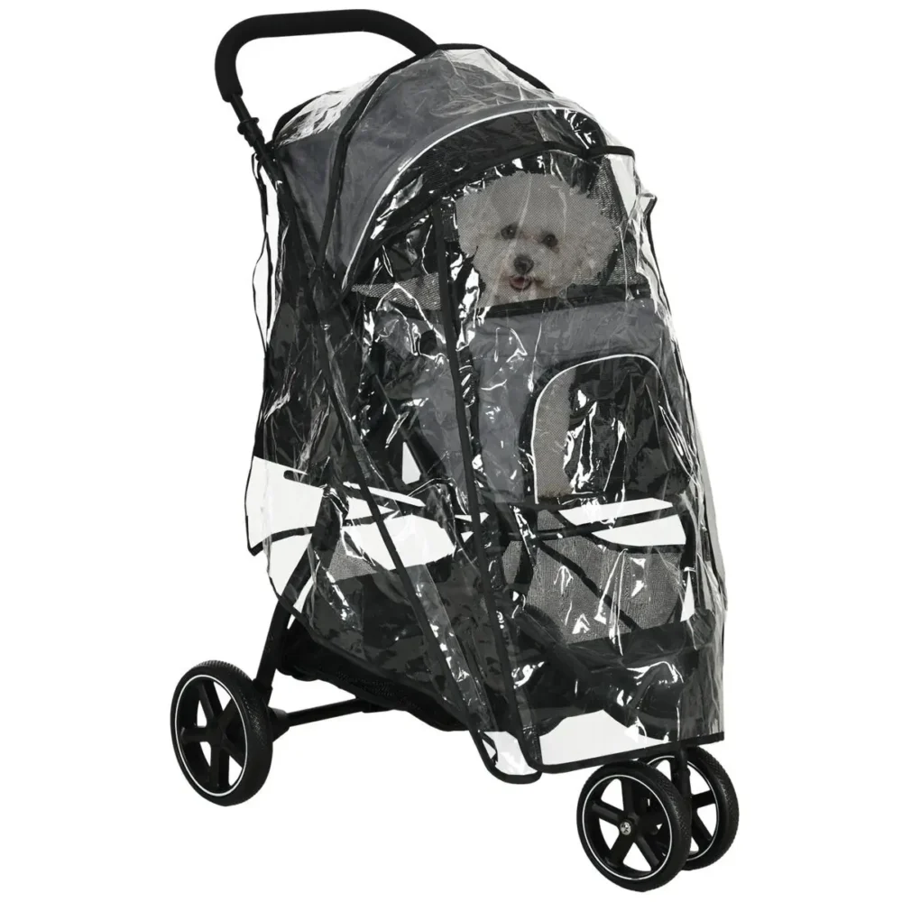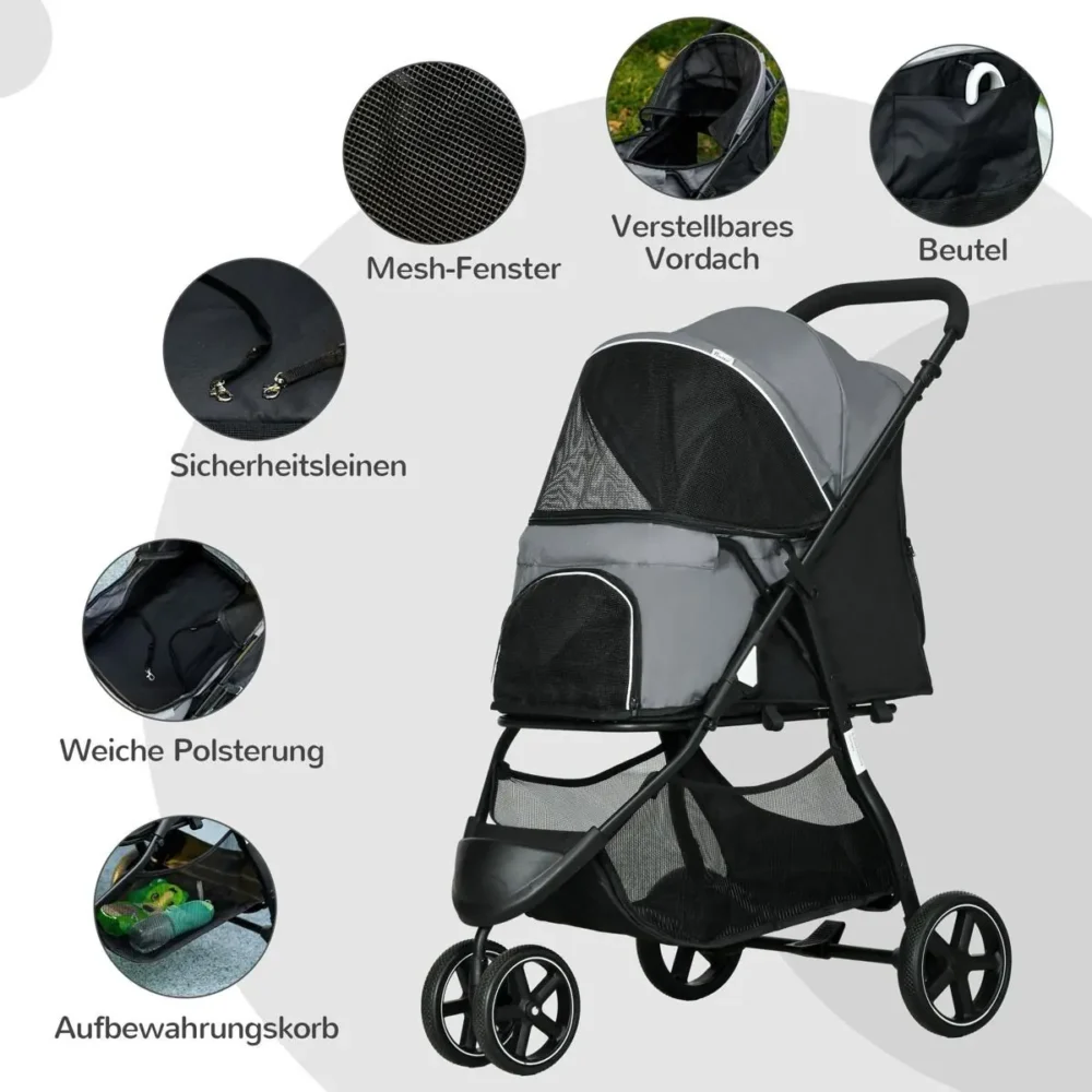 Ge din fyrbenta vän den ultimata reseupplevelsen med denna mångsidiga och eleganta hundvagn. Oavsett om det handlar om en shoppingtur, ett veterinärbesök eller en långpromenad i parken, erbjuder denna husdjursvagn en säker och bekväm tillflyktsort för små hundar och katter upp till 10 kg. Den robusta konstruktionen kombinerat med smarta funktioner som inkluderat regnskydd och enkel hopfällning gör den till ett oumbärligt tillbehör för den aktiva djurägaren.