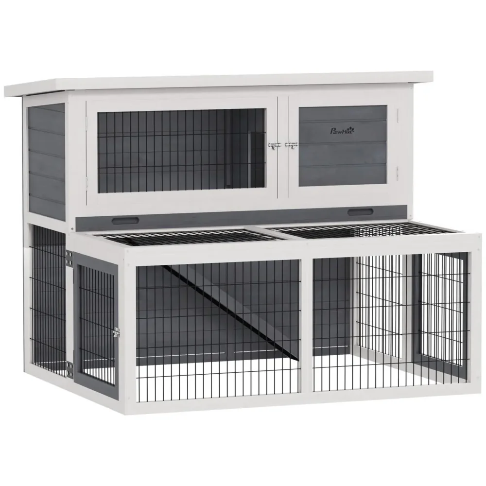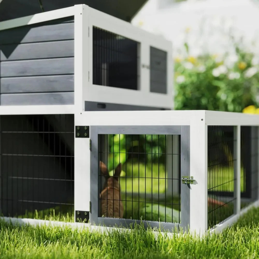 Ge dina kaniner ett lyxigt och tryggt hem med denna stora vinterbonade kaninbur i två våningar. Denna robusta utomhusbur är specifikt utformad för att erbjuda högsta möjliga komfort för 2–3 kaniner eller marsvin. Tillverkad i högkvalitativt granträ och utrustad med ett skyddande asfalttak, är buren byggd för att tåla utmanande väderförhållanden samtidigt som den ser elegant ut i trädgården. Med en rymlig hage nertill och en mysig sovavdelning upptill får dina husdjur den perfekta balansen mellan aktivitet och vila.