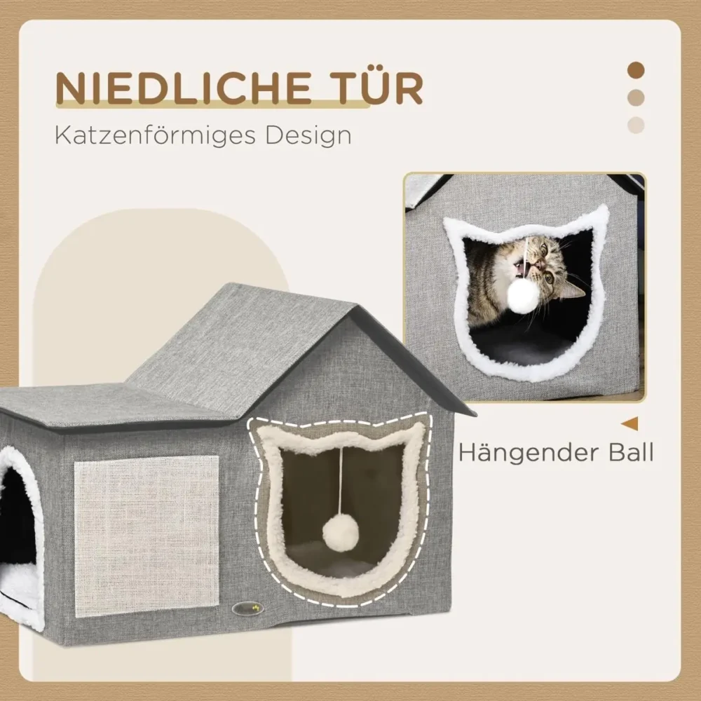 - Stilfullt gömställe: Den moderna designen med kattformade detaljer och fluffiga kanter gör katthuset till en snygg inredningsdetalj.