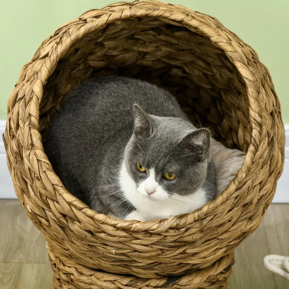 Ge din fyrbenta vän en kunglig viloplats med denna eleganta kattkorg i vattenhyacint. Denna upphöjda kattbädd kombinerar funktionalitet med estetik och erbjuder din katt en skyddad grotta att dra sig tillbaka till. Den naturliga designen stimulerar kattens instinkter samtidigt som den moderna rottingstilen gör korgen till en vacker inredningsdetalj i hemmet.