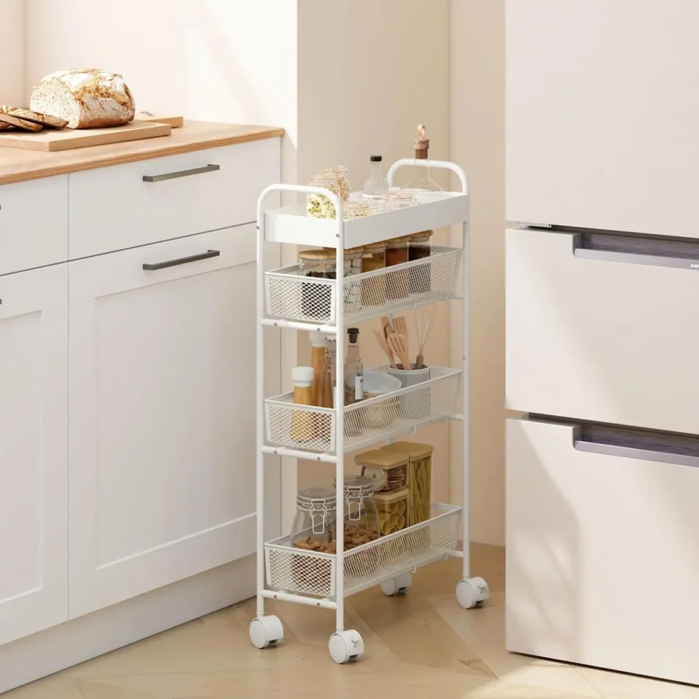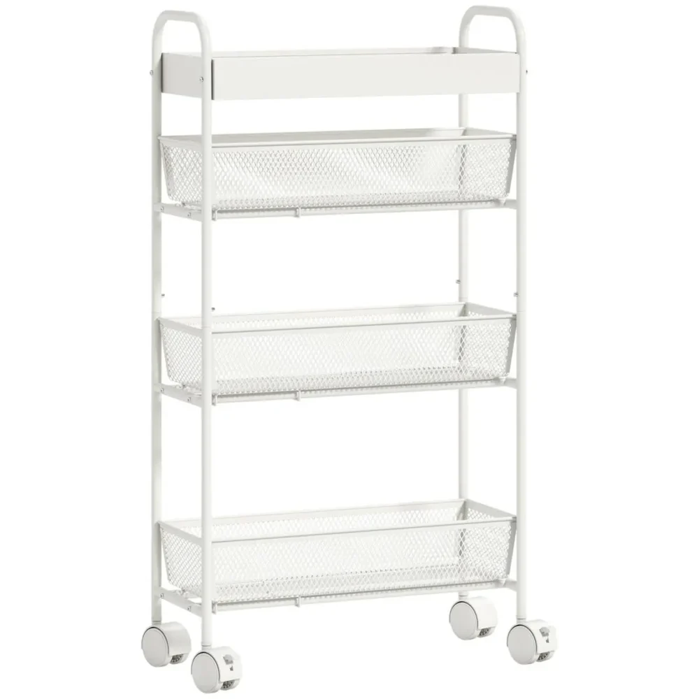 Bli först med att recensera ”Köksvagn i vit metall med 3 korgar och hjul – Smal rullvagn för kök och badrum (19 cm bred)”