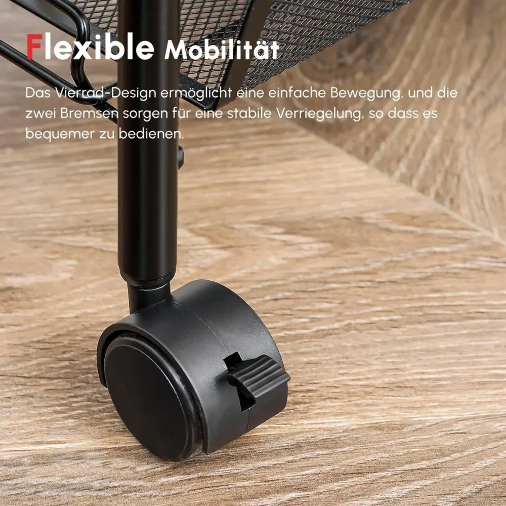 - Hög flexibilitet: Fyra lättrullade hjul gör vagnen mobil, medan de integrerade låsbromsarna garanterar att den står stadigt vid behov.