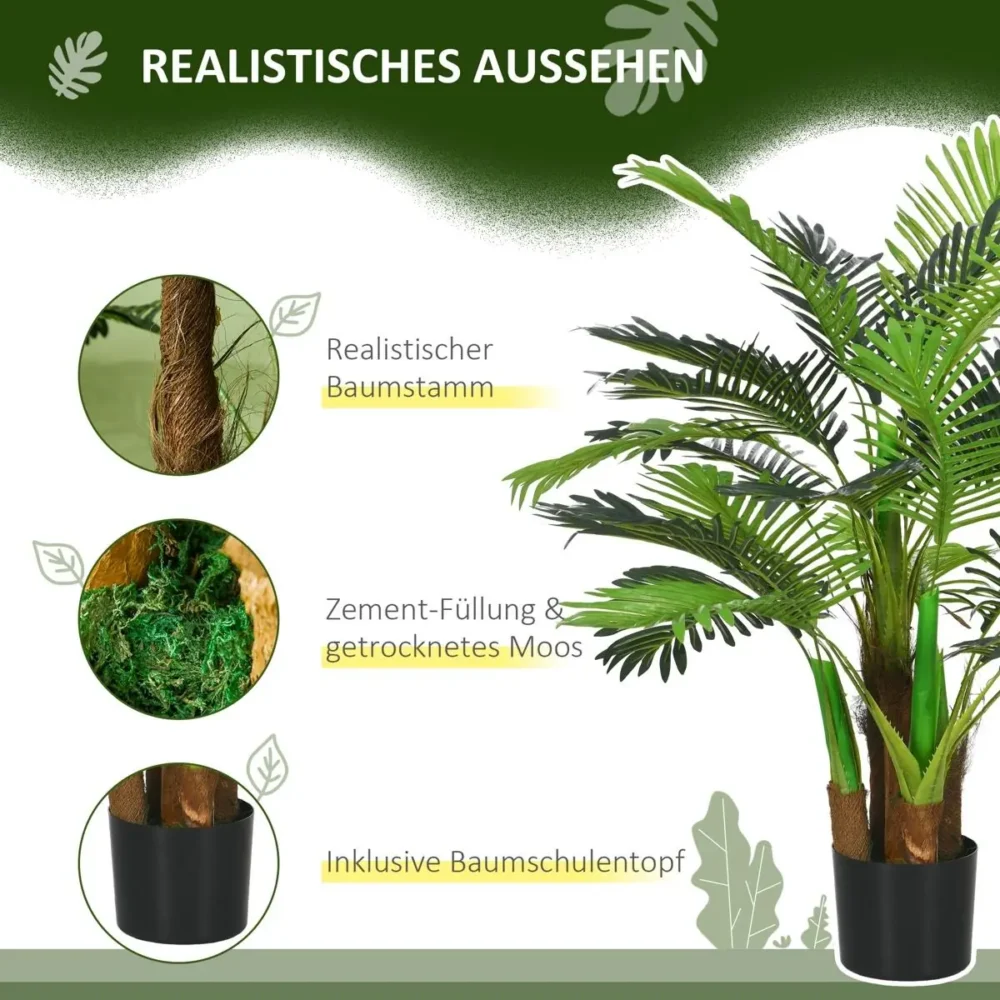 Ge ditt hem, kontor eller din uteplats en tidlös tropisk känsla med denna verklighetstrogna konstgjorda palm. Med en höjd på 1 meter och 27 frodiga blad erbjuder denna växt en omedelbar visuell uppgradering. Den är designad för att se helt äkta ut, komplett med fem detaljerade stammar och autentisk mossa i krukan, vilket gör den till ett utmärkt val för både moderna och klassiska miljöer utan krav på gröna fingrar.