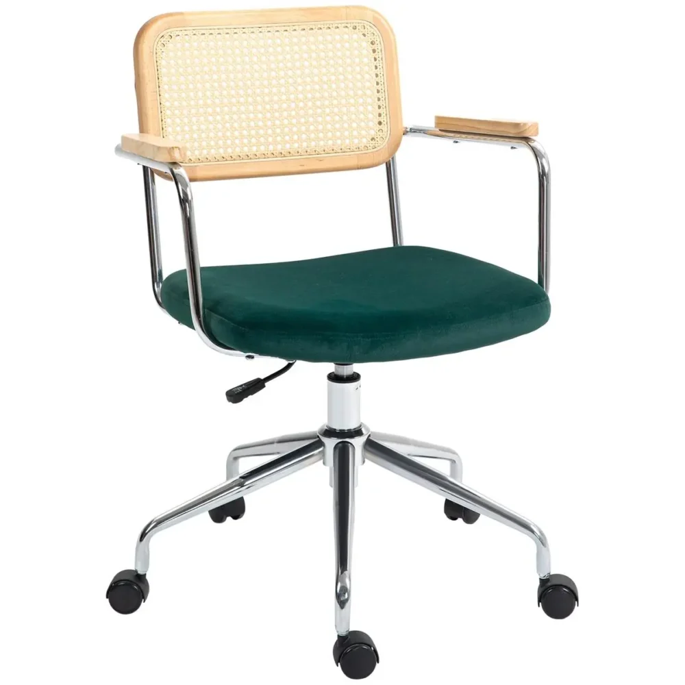 Bli först med att recensera ”Kontorsstol i Boho-design – Grön Sammetslook med Rottingryggstöd & Träarmstöd – Justerbar Skrivbordsstol för Hemmakontor (Max 120 kg)”