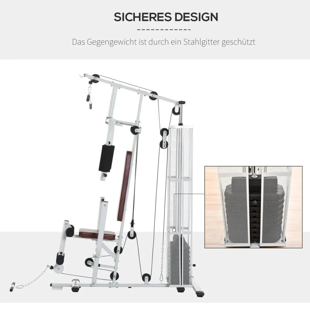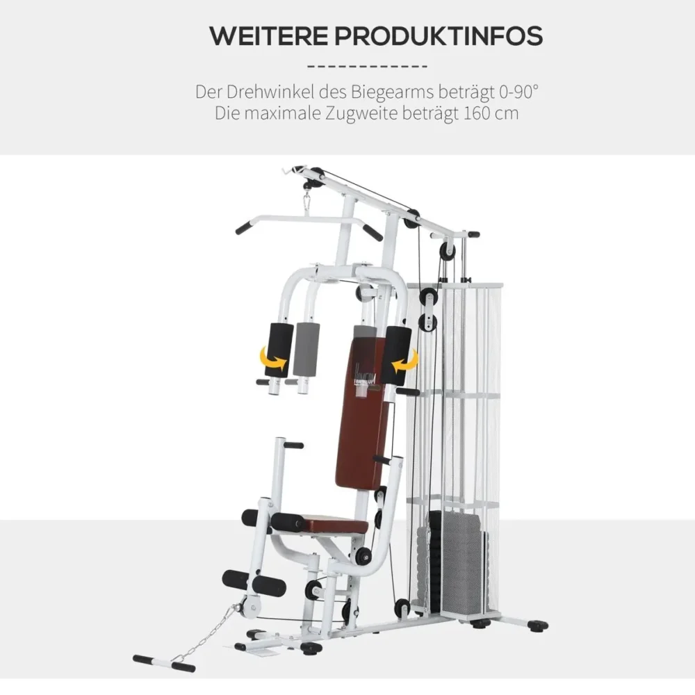 Förvandla ditt hem till ett komplett gym med denna mångsidiga kraftstation. Oavsett om du vill bygga muskler eller behålla formen erbjuder detta hemmagym en effektiv lösning för hela kroppen. Den robusta konstruktionen i vit metall gör den både snygg och hållbar, perfekt för källaren, gästrummet eller kontoret.
