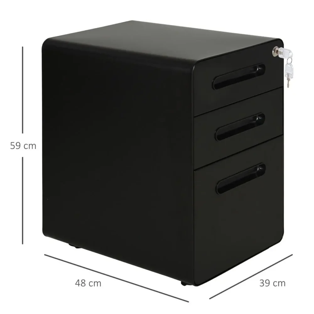 Håll ordning på din arbetsplats med denna praktiska och stilrena rullhurts i svart stål. Detta mobila arkivskåp är den ultimata lösningen för att organisera dokument, kontorsmaterial och hängmappar, oavsett om det är på hemmakontoret eller arbetsplatsen. Den kompakta designen gör att den enkelt får plats under skrivbordet, samtidigt som den robusta stålkonstruktionen garanterar lång hållbarhet.