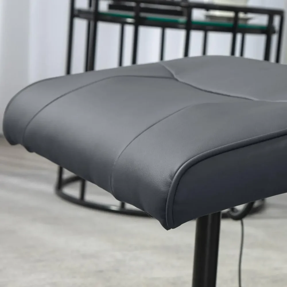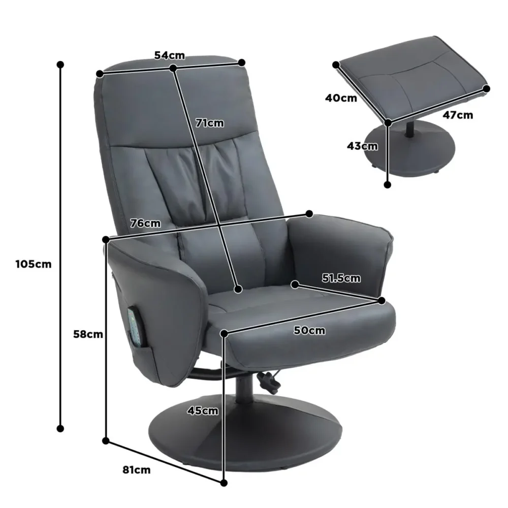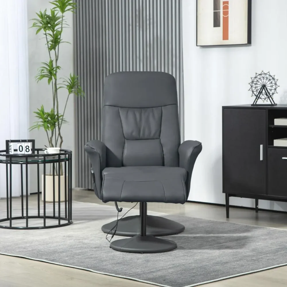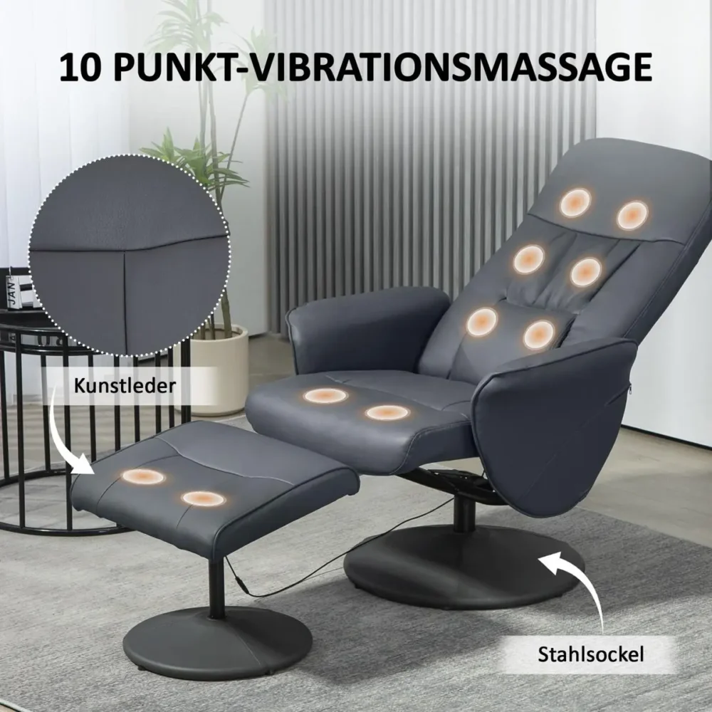 Ge dig själv den ultimata vardagslyxen med denna ergonomiska massagefåtölj. Med sin medföljande fotpall och integrerade vibrationssystem erbjuder stolen en komplett relaxupplevelse som snabbt smälter bort stress och spänningar. Den eleganta designen i mörkgrått konstläder gör att den passar perfekt i både vardagsrummet och hemmakontoret.