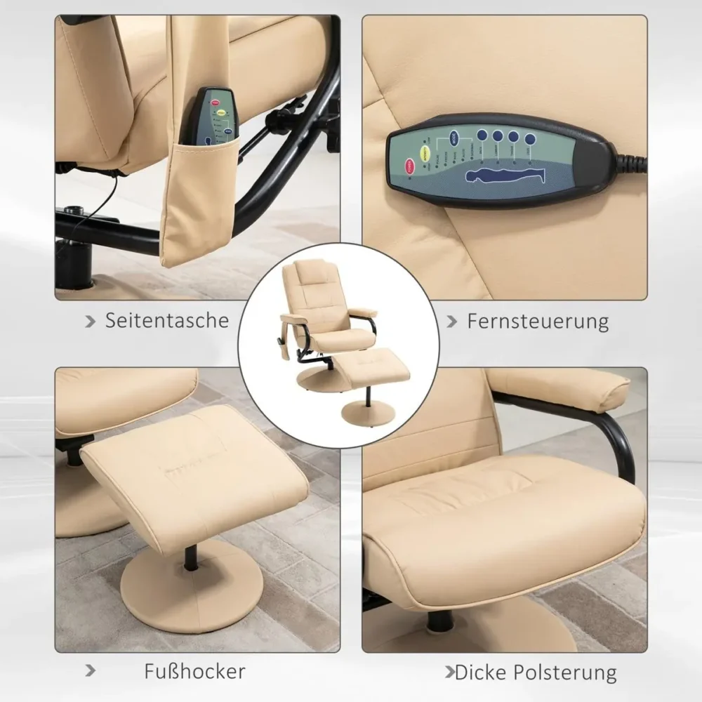Skapa en egen oas av välbefinnande i ditt vardagsrum med denna eleganta massagefåtölj. Efter en intensiv dag förtjänar du att luta dig tillbaka och låta de tio integrerade vibrationspunkterna lösa upp spänningar i nacke, rygg och ben. Med sin stilrena design i krämvitt konstläder och medföljande fotpall blir denna relaxfåtölj snabbt hemmets mest populära plats.