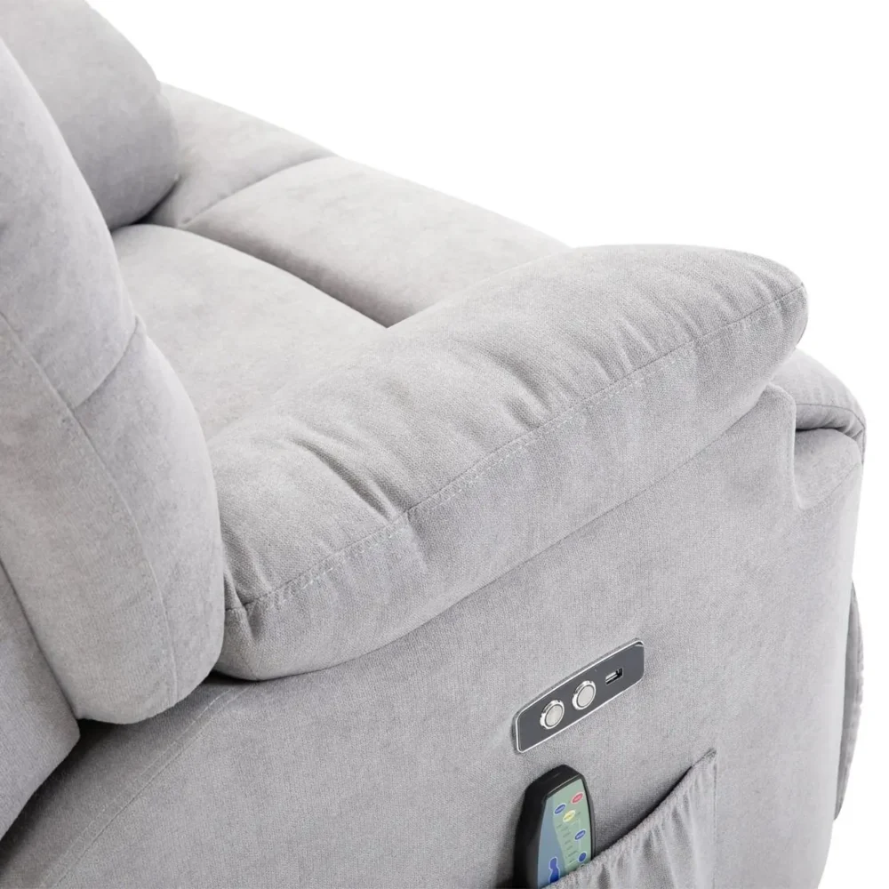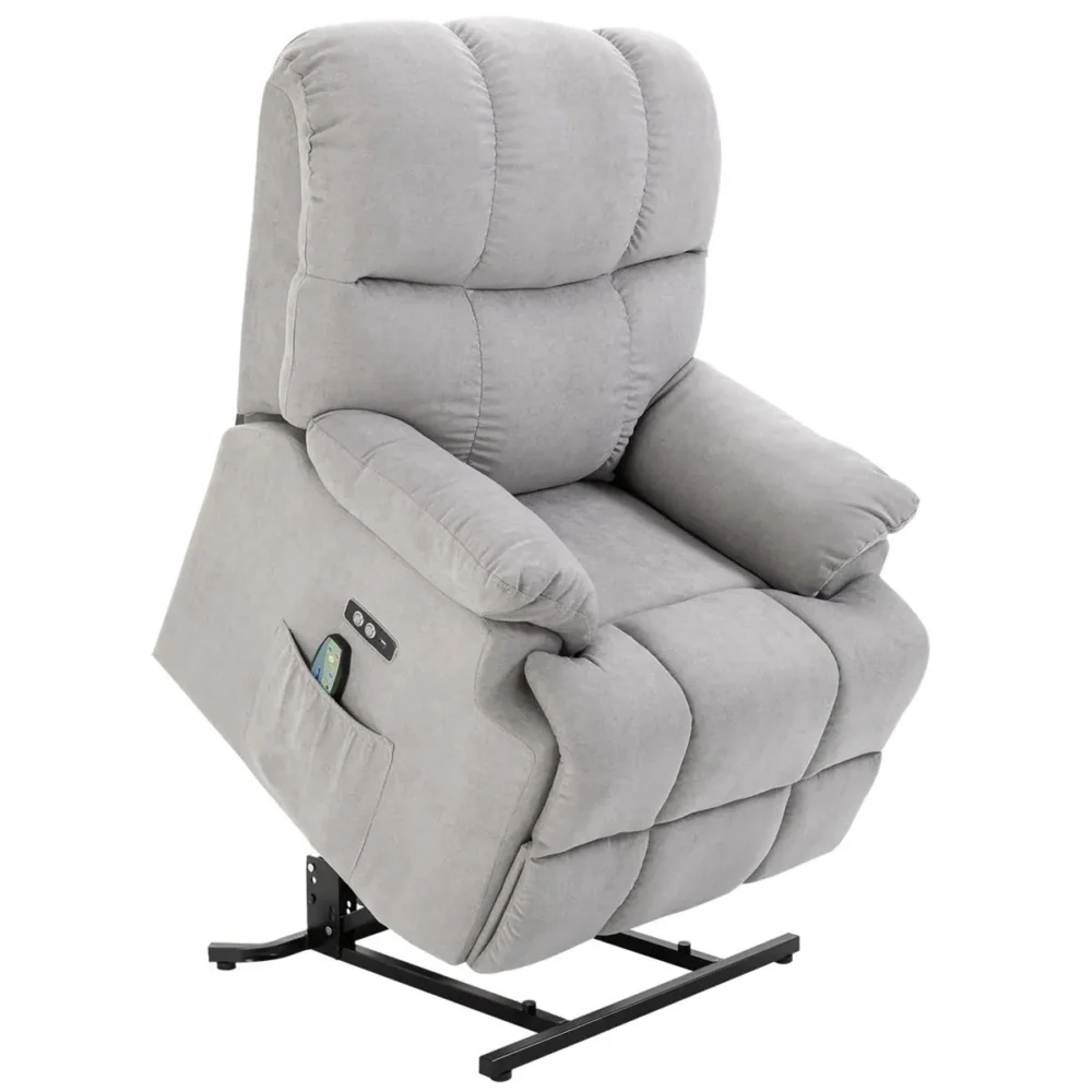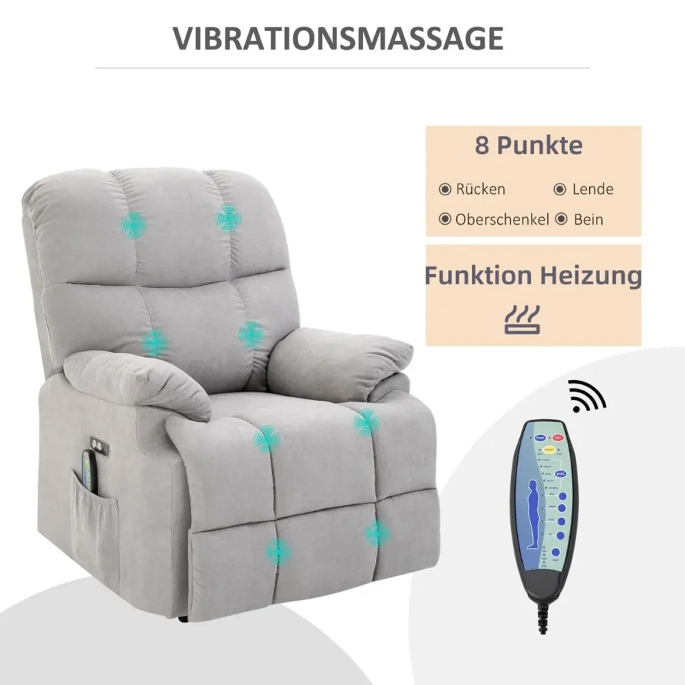Upplev den ultimata kombinationen av lyx och funktionalitet med denna grå massagefåtölj i sammetslook. Denna relaxfåtölj är speciellt framtagen för att erbjuda maximal komfort och praktiskt stöd i vardagen. Med den inbyggda uppstigningshjälpen kan du enkelt och tryggt resa dig upp, medan åtta strategiskt placerade massagepunkter ger din kropp den återhämtning den förtjänar efter en lång dag.