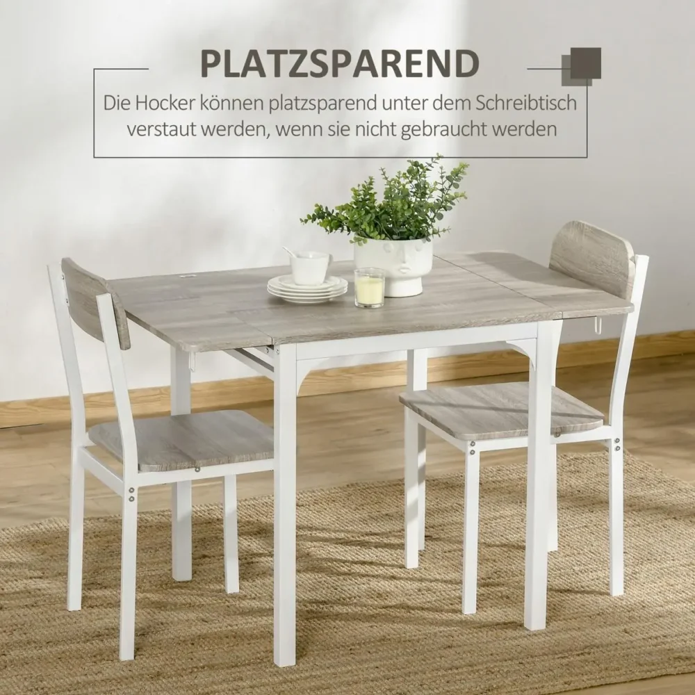 Denna eleganta 3-delade matgrupp är den ultimata lösningen för det lilla hemmet eller det kompakta köket. Med sin smarta fällbara konstruktion erbjuder matbordet maximal flexibilitet – använd det som ett fullstort matbord, fäll ner en klaff för en mindre sittyta eller fäll ihop det helt för att använda det som ett snyggt sidobord. Den ljusa färgkombinationen av vitt och naturfärgat trä ger en modern och fräsch känsla som lyfter din inredning.