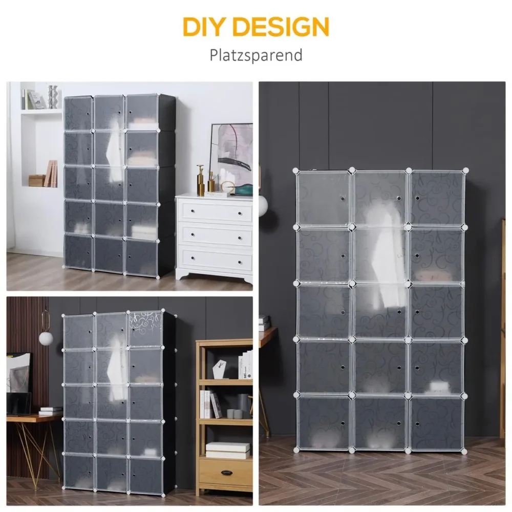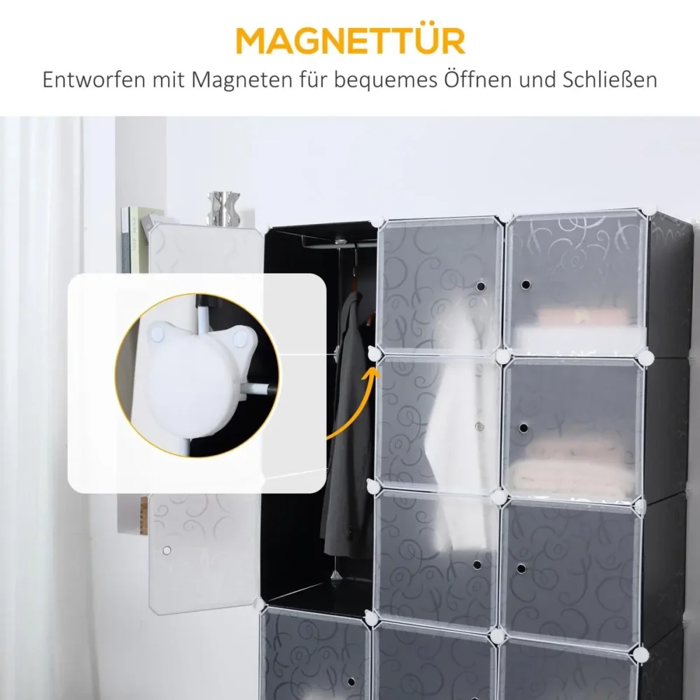 Skapa ordning och reda med denna smarta och modulära garderob i kubdesign. Detta innovativa förvaringssystem ger dig friheten att anpassa möbeln efter ditt utrymme, oavsett om det är i sovrummet, hallen eller barnrummet. Den stilrena svartvita designen passar in i de flesta moderna hem och erbjuder en flexibel lösning för alla dina förvaringsbehov utan att tumma på funktionen.