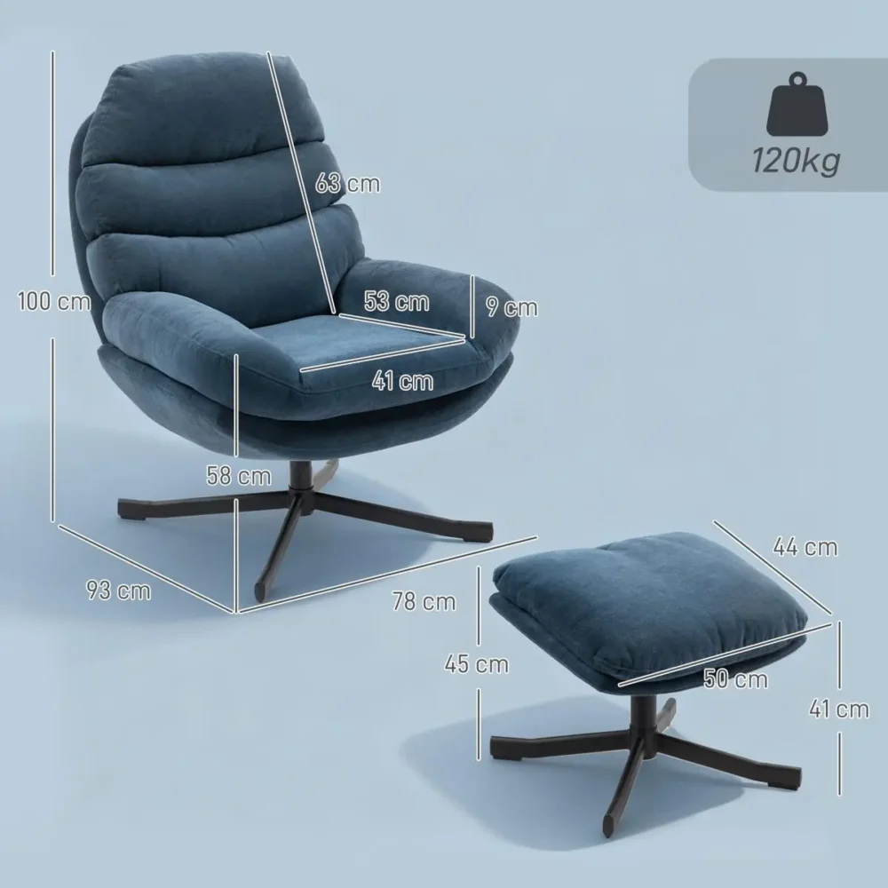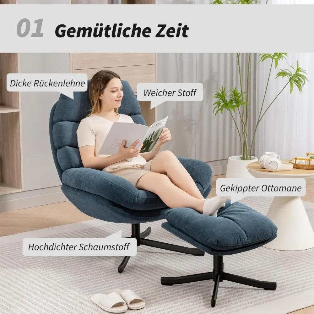 Bli först med att recensera ”Reläxfåtölj med fotpall i blå chenille – Modern loungestol med 360° rotation, tjock vaddering och ergonomisk design för vardagsrum – 78x93x100 cm”