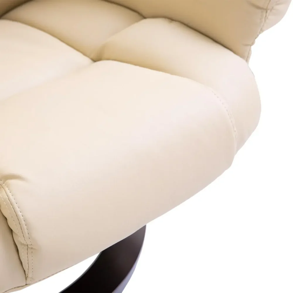 Förvandla ditt vardagsrum till en privat oas av lugn med denna eleganta relaxfåtölj med tillhörande fotpall. Denna kombination är skapad för dig som värdesätter både stilren design och överlägsen sittkomfort. Med en mjukt stoppad sits klädd i högkvalitativt creme-färgat konstläder får du en möbel som inte bara är skön att sitta i, utan också fungerar som en estetisk höjdpunkt i din inredning.