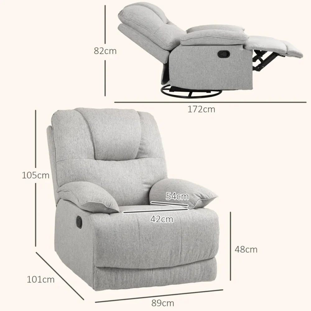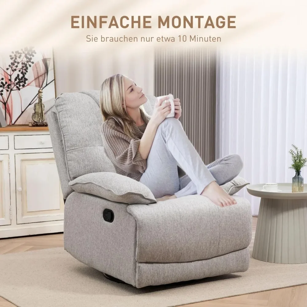 Unna dig själv en paus i vardagen med denna eleganta relaxfåtölj. Designad med fokus på både estetik och välbefinnande, kombinerar denna reclinerfåtölj modern funktionalitet med klassisk komfort. Det ventilerande tyget i linneimitation och den generösa stoppningen gör den till hemmets givna favoritplats för såväl en snabb vila som en helkväll framför favoritfilmen.