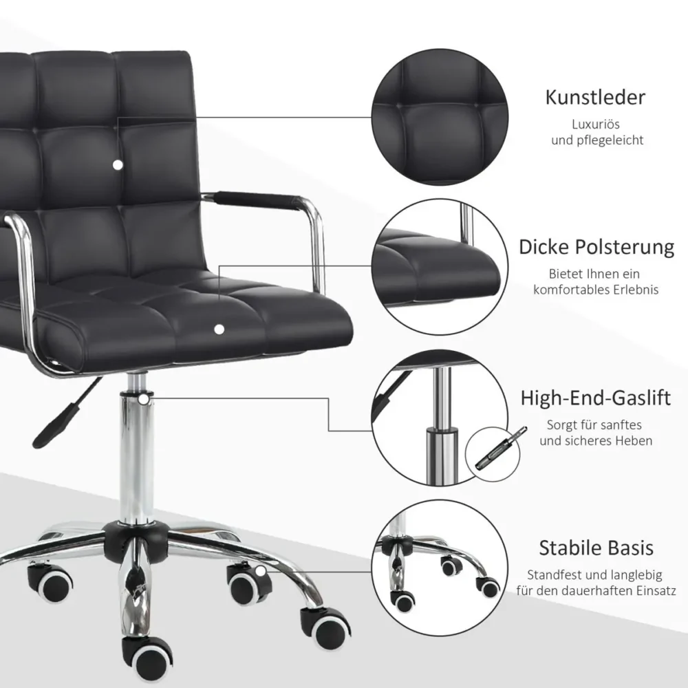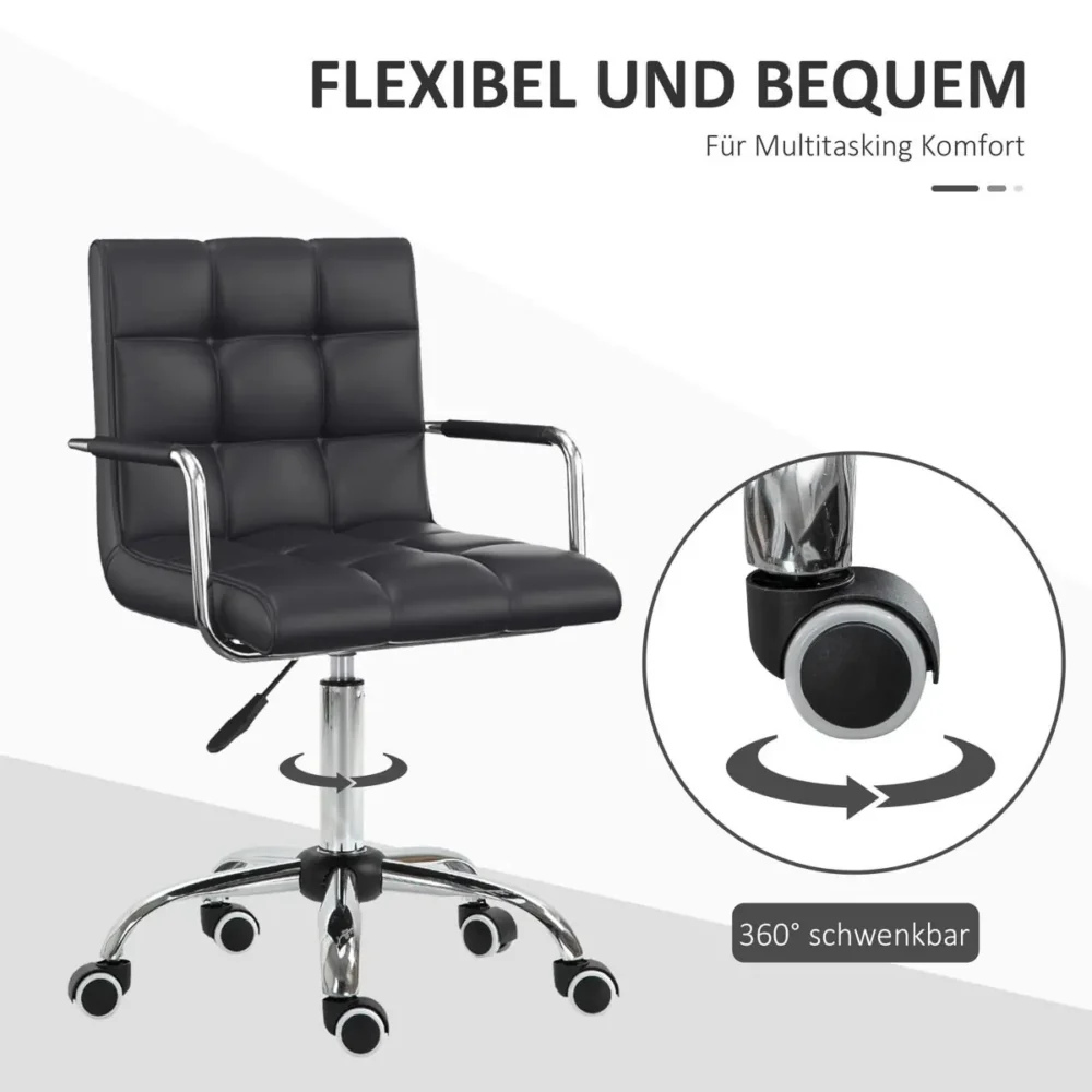 Uppgradera ditt hemmakontor eller din arbetsplats med denna exklusiva kontorsstol i retrodesign. Denna snurrstol kombinerar tidlös estetik med modern funktionalitet, vilket gör den till ett utmärkt val för dig som värdesätter både stil och komfort. Den svarta klädseln i högkvalitativt konstläder pryds av eleganta sömmar som bildar ett klassiskt kvadratiskt mönster, medan den kromade basen ger en lyxig finish.