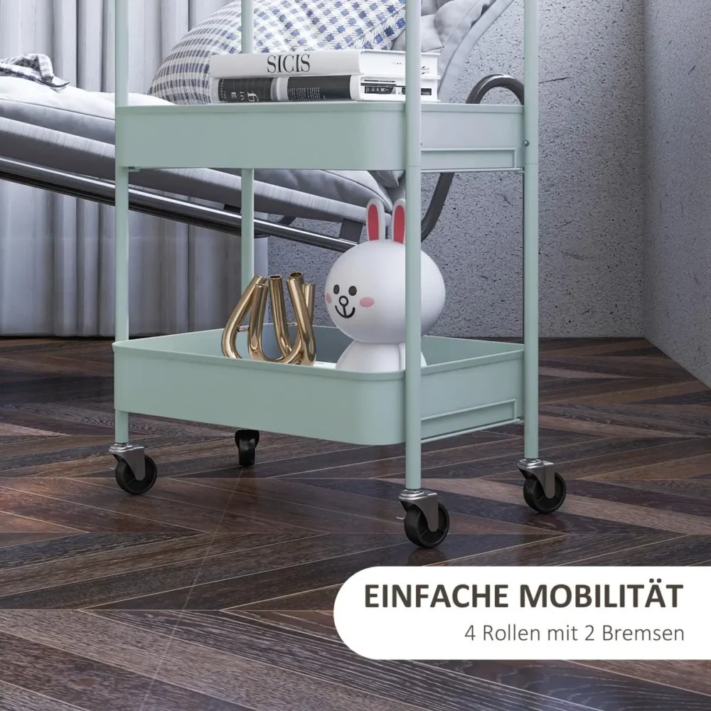 Behöver du mer förvaring på en begränsad yta? Denna ljusblå rullvagn kombinerar praktisk funktionalitet med en stilren design, vilket gör den till den ultimata lösningen för både kök, badrum och kontor. Med sin kompakta storlek och tre rymliga hyllplan skapar den ordning i kaoset och håller dina vardagsprylar lättillgängliga och organiserade.