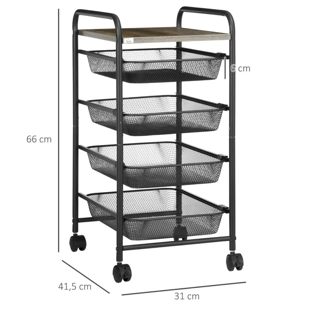 Denna kompakta och eleganta rullvagn är den ultimata lösningen för dig som behöver extra förvaring på begränsade ytor. Med sin smarta konstruktion bestående av fyra utdragbara nätkorgar och en stabil bordsskiva får du fem nivåer av organiserat utrymme. Oavsett om du behöver organisera kryddor i köket, hygienartiklar i badrummet eller kontorsmaterial i arbetsrummet, anpassar sig denna universalvagn efter dina unika behov och förenklar vardagen.