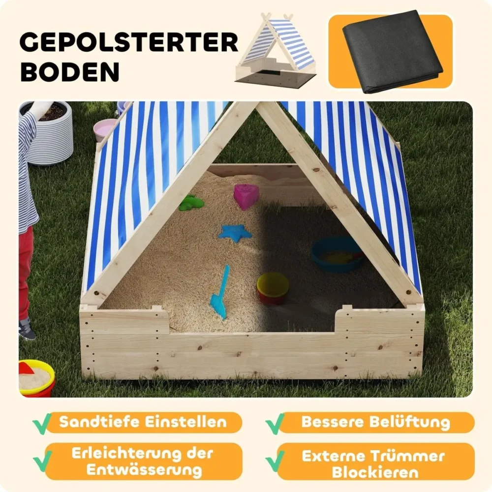Bli först med att recensera ”Sandlåda för barn med väderbeständigt tälttak och markduk – 120×120 cm i robust granträ för 3-6 år”