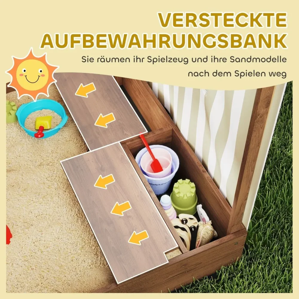 Bli först med att recensera ”Sandlåda med tak och nätdörr för barn – Brun trädgårdssandlåda med 4 sittplatser, förvaring och markduk – 142×102 cm”