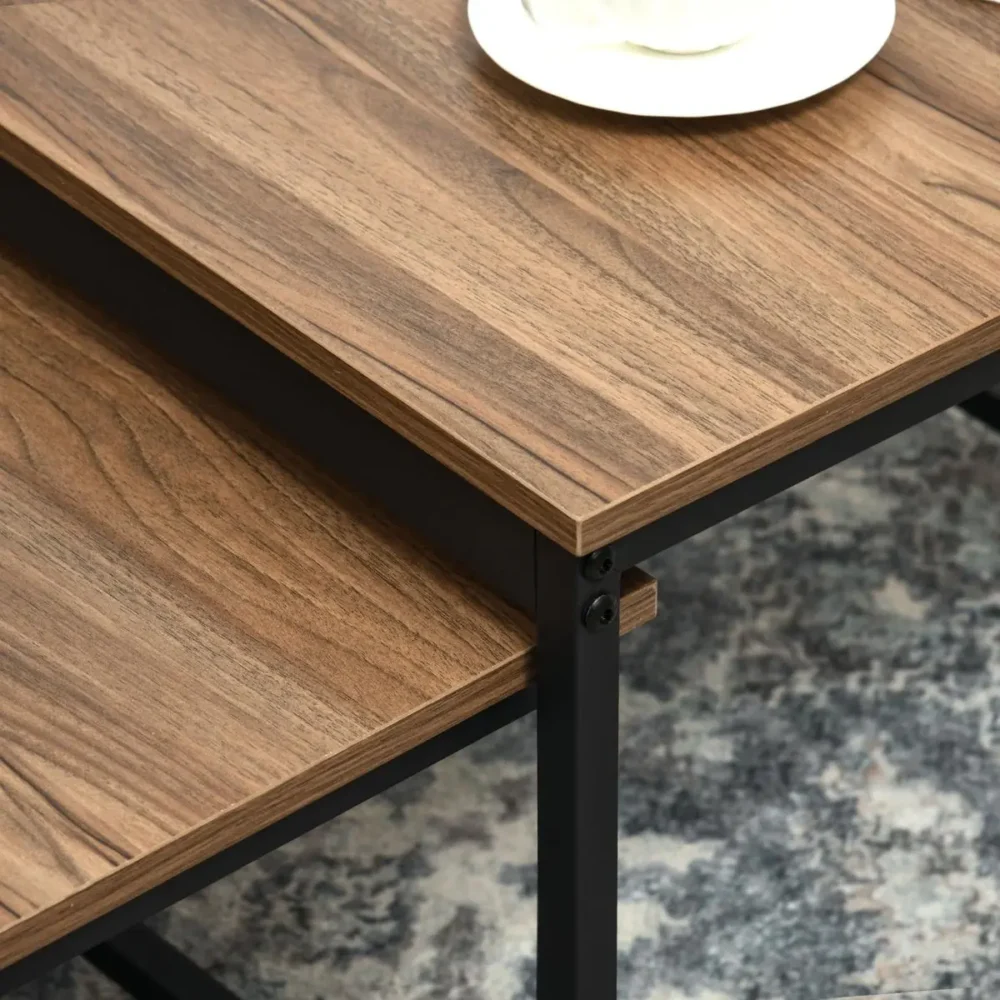 Förhöj stämningen i ditt hem med detta mångsidiga satsbord-set i två delar. Dessa sidobord i industriell stil kombinerar en robust svart stålram med en vacker bordsskiva i träfinish, vilket ger rummet en modern och sofistikerad karaktär. Tack vare den smarta designen kan du enkelt anpassa möbleringen efter behov – använd dem som ett enhetligt soffbord eller placera dem separat som praktiska avlastningsytor bredvid soffan eller sängen.