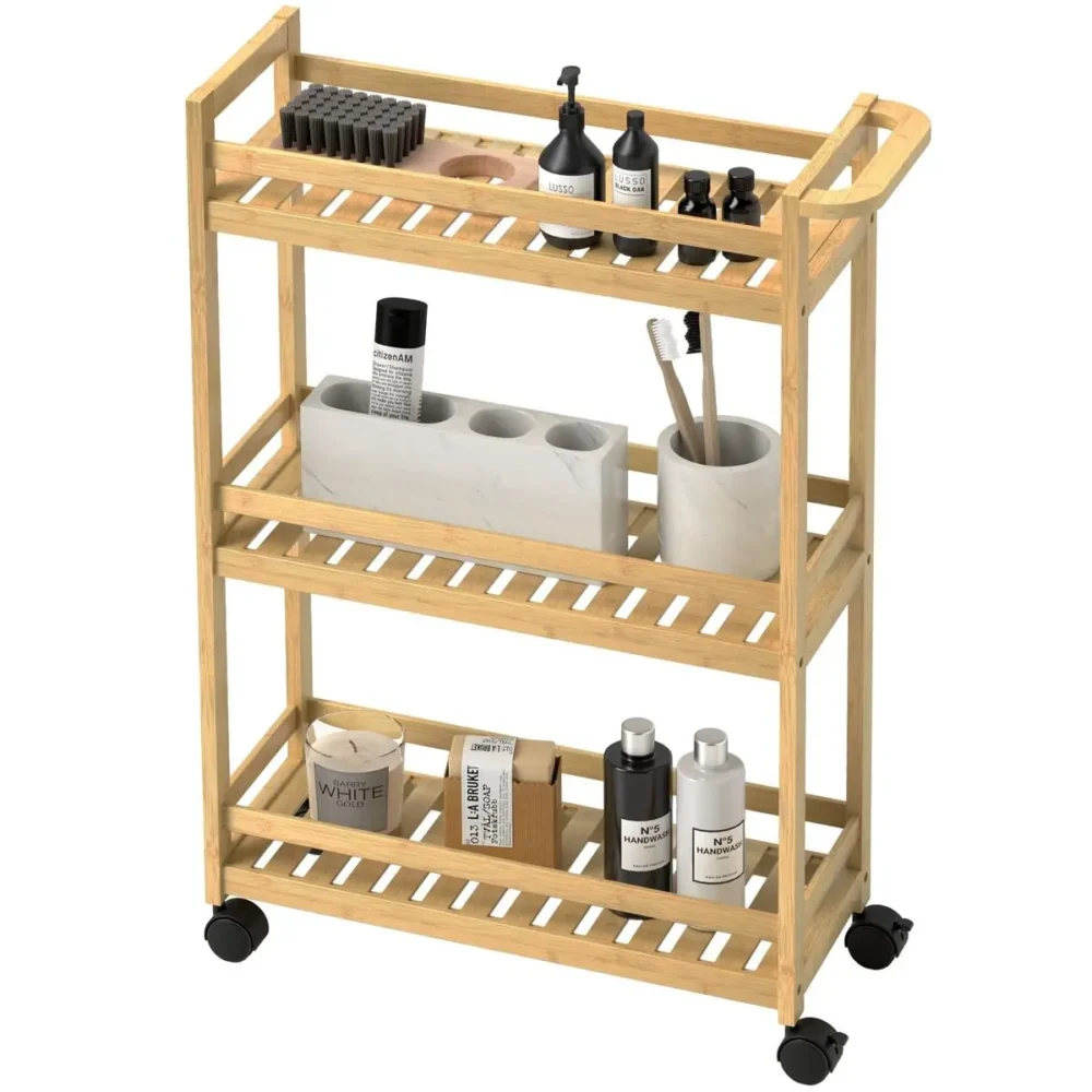 Optimera din förvaring med denna eleganta och funktionella serveringsvagn i bambu. Med sin kompakta bredd på endast 20 cm är denna rullvagn den perfekta lösningen för att utnyttja smala utrymmen i köket, badrummet eller tvättstugan. Den naturliga finishen i kombination med de praktiska funktionerna gör den till en oumbärlig detalj för ett organiserat hem.