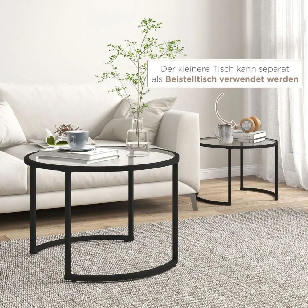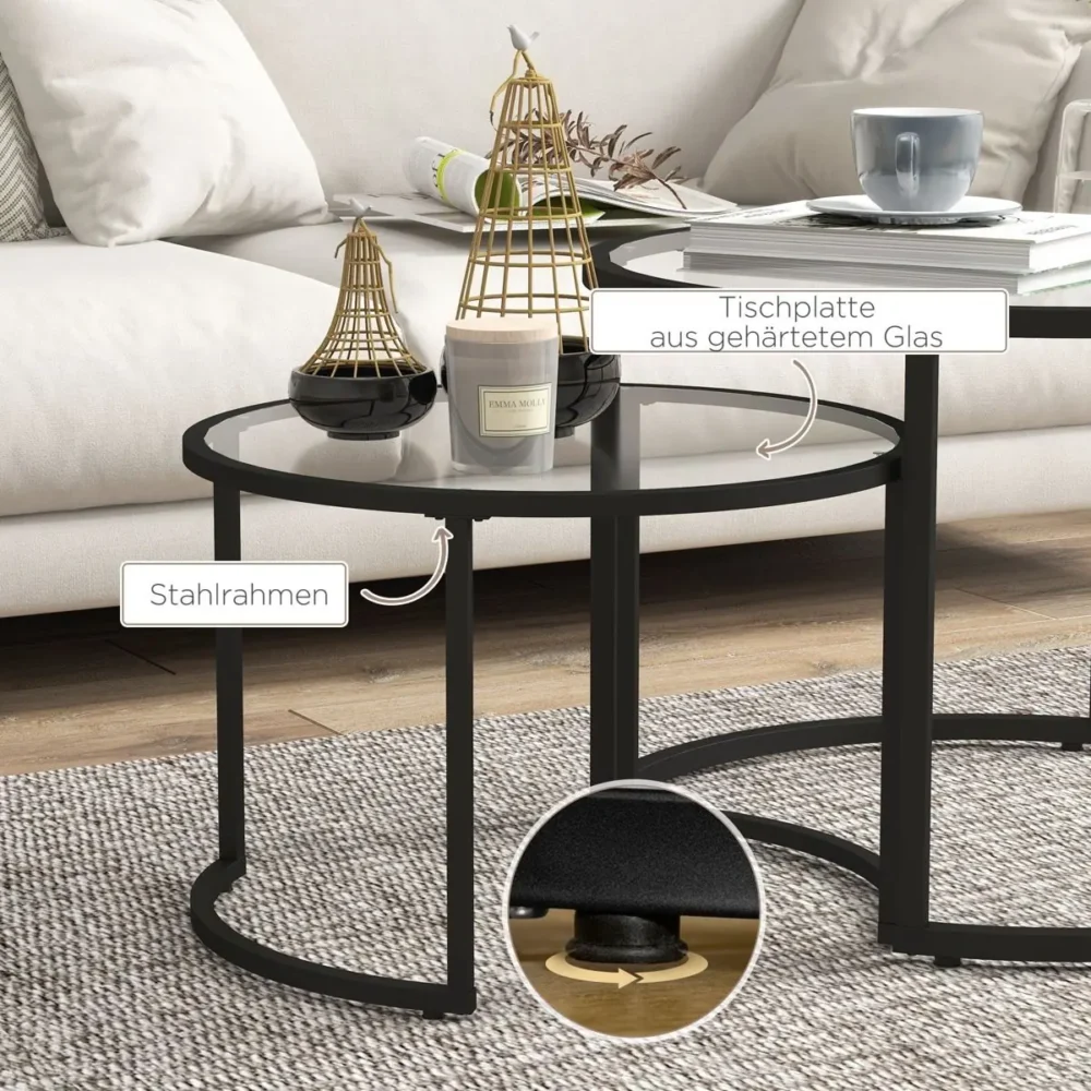 Bli först med att recensera ”Set med 2 sidobord & soffbord i industriell design – Stapelbara satsbord i svart stål och härdat glas – Ø70 cm & Ø54 cm”
