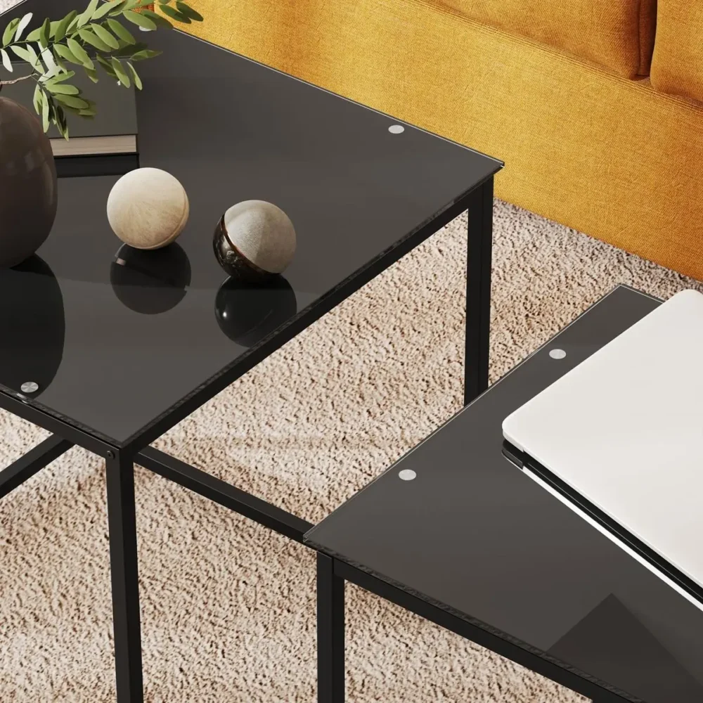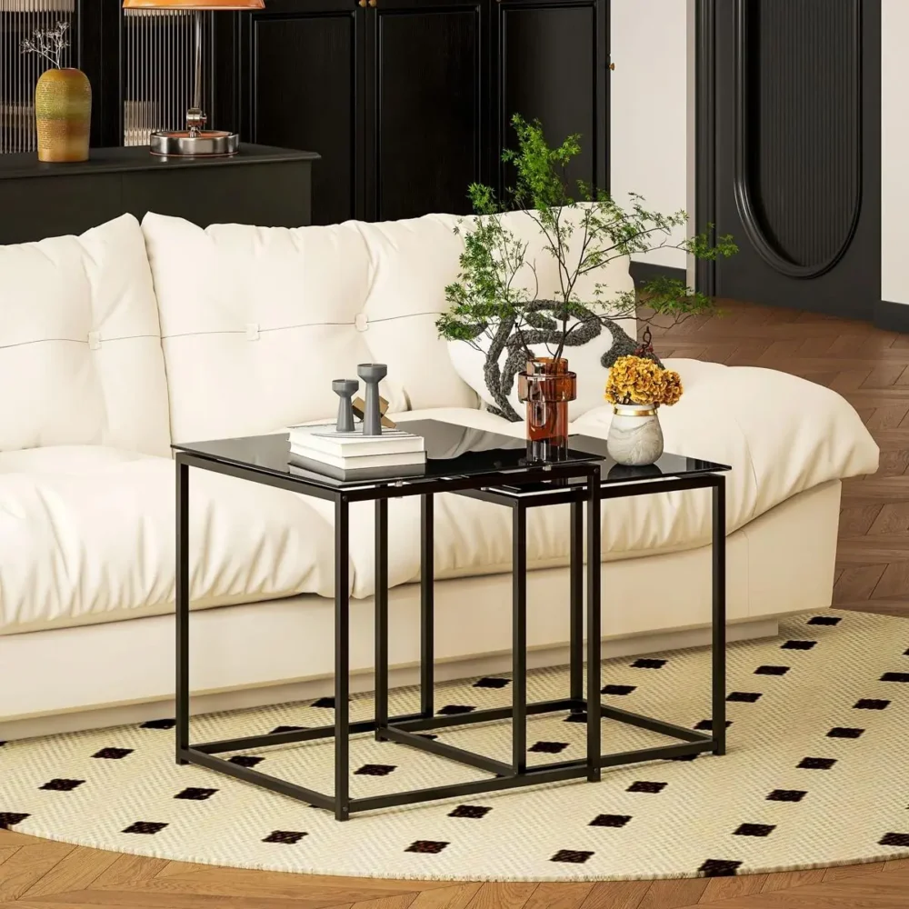 Bli först med att recensera ”Sidobord Set om 2 – Moderna Stapelbara Soffbord i Svart Härdat Glas och Stål – Platsbesparande Design för Vardagsrum”