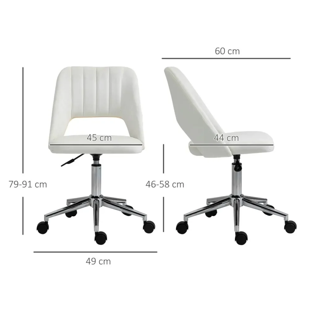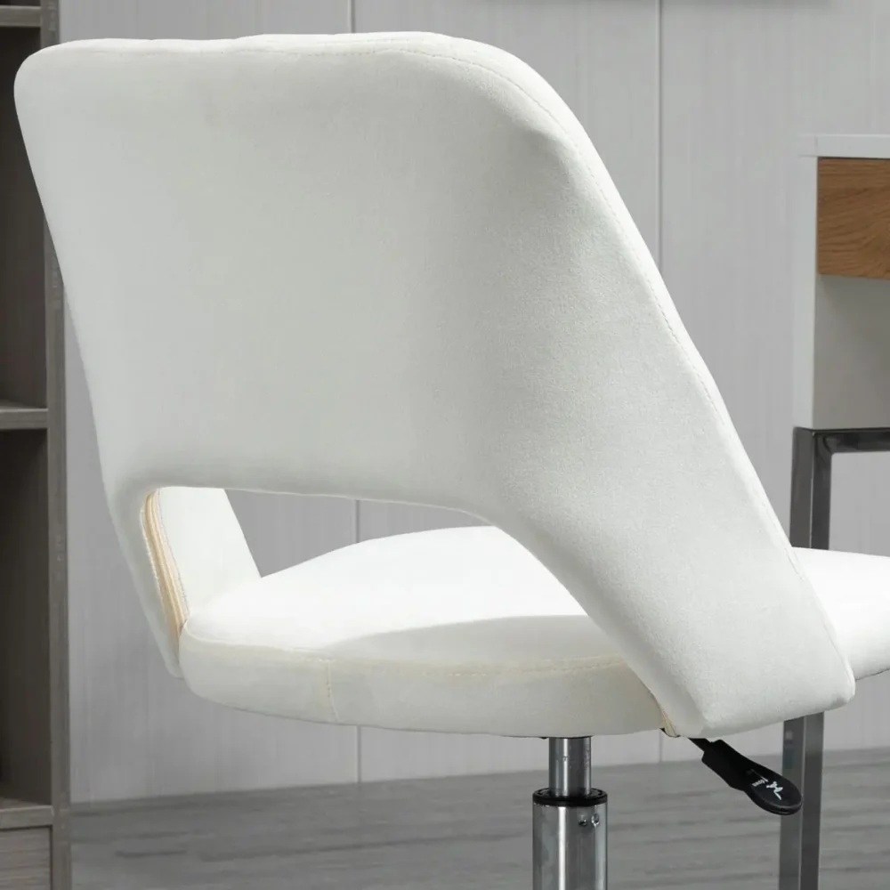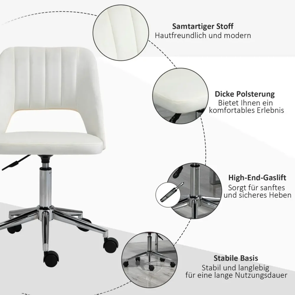 Ge ditt hemmakontor en stilfull uppgradering med denna eleganta skrivbordsstol i krämvit sammet. Denna kontorsstol kombinerar modern estetik med hög funktionalitet, där den snäckformade ryggen inte bara fungerar som ett vackert blickfång utan även ger ett behagligt stöd för ryggen. Oavsett om du arbetar, studerar eller använder den som en lyxig sminkstol, erbjuder den mjuka vadderingen och den justerbara höjden optimal komfort för längre sittpass.
