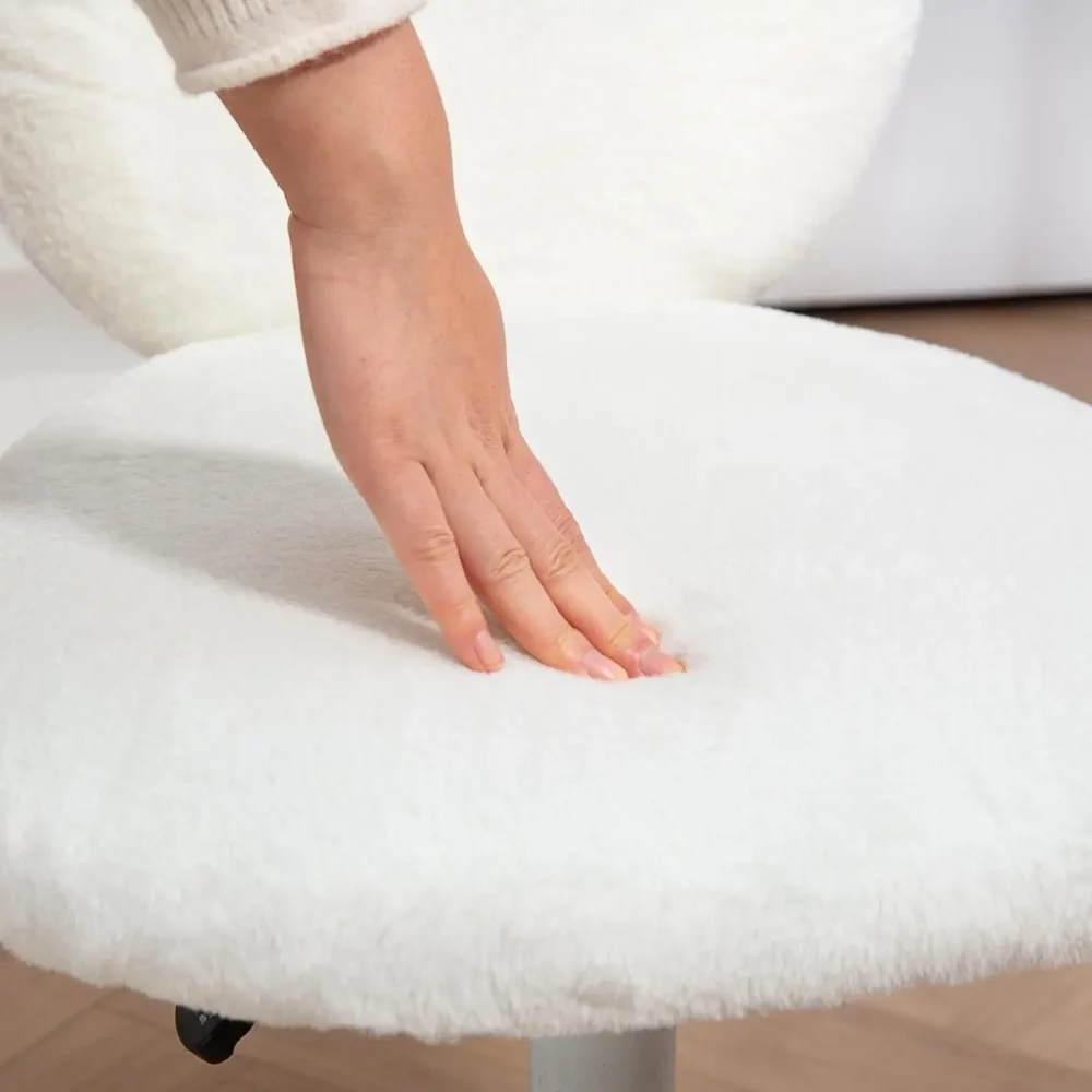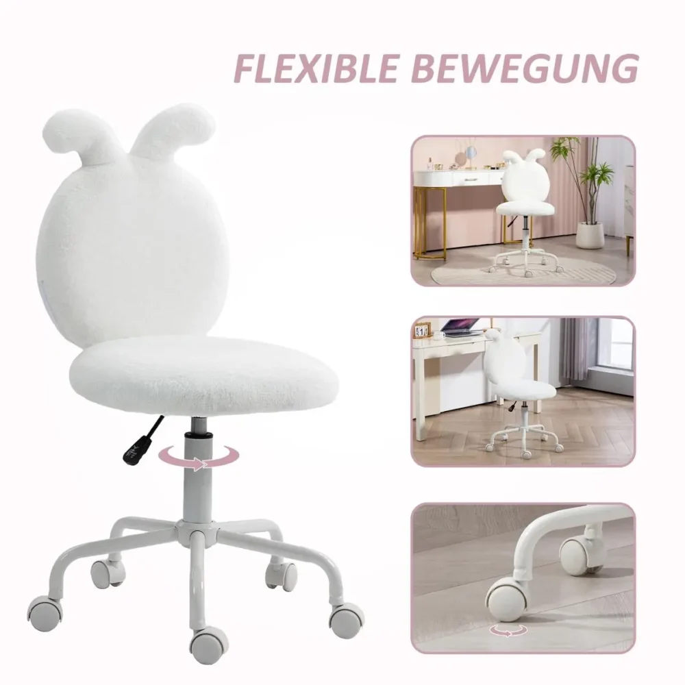 Ge ditt hemmakontor en touch av lekfull elegans med denna unika skrivbordsstol med kaninöron. Denna kontorsstol kombinerar en söt estetik med praktisk funktionalitet, vilket gör den till det perfekta valet för både det kreativa arbetsrummet och som en stilren sminkstol. Med sin mjuka klädsel i vit konstpäls och sitt ergonomiska stöd erbjuder den en bekväm sittupplevelse som förgyller arbetsdagen.