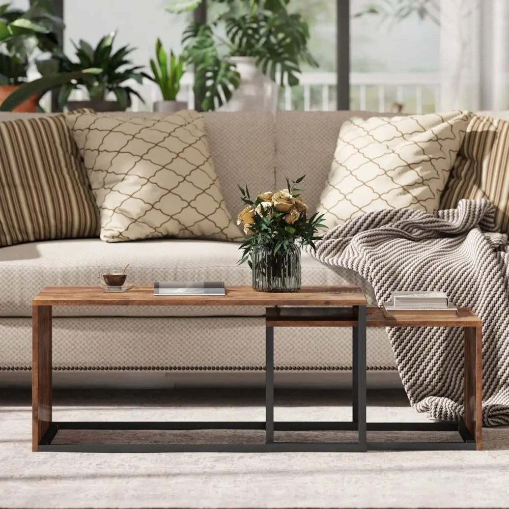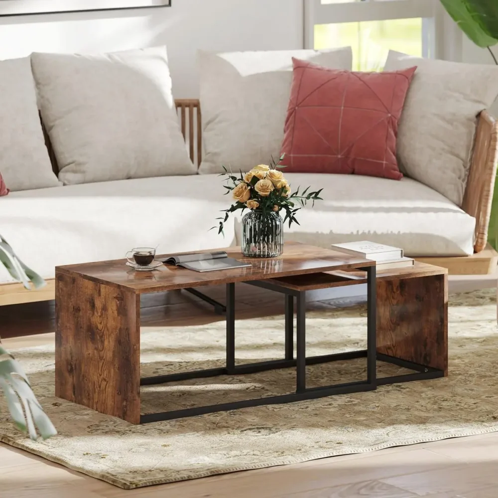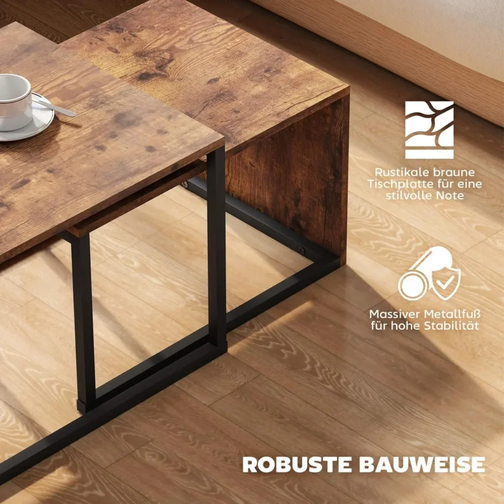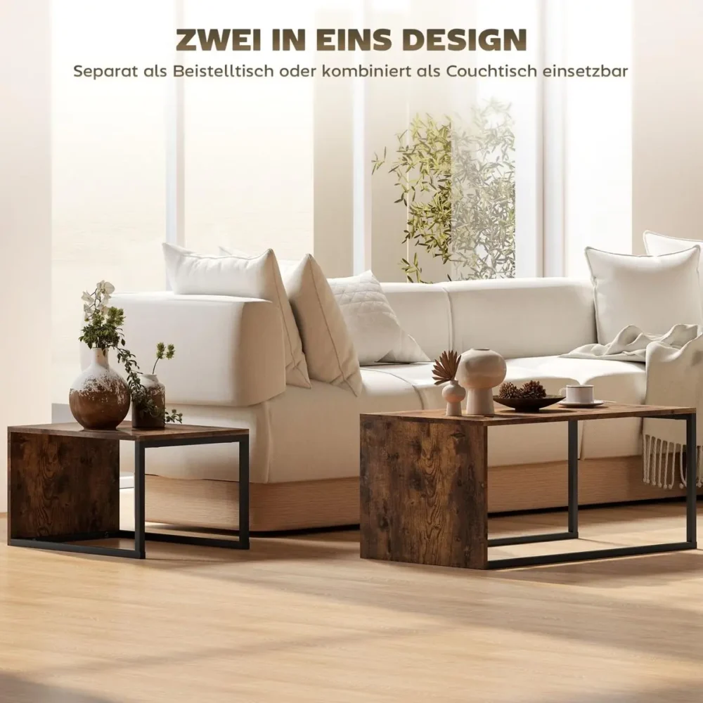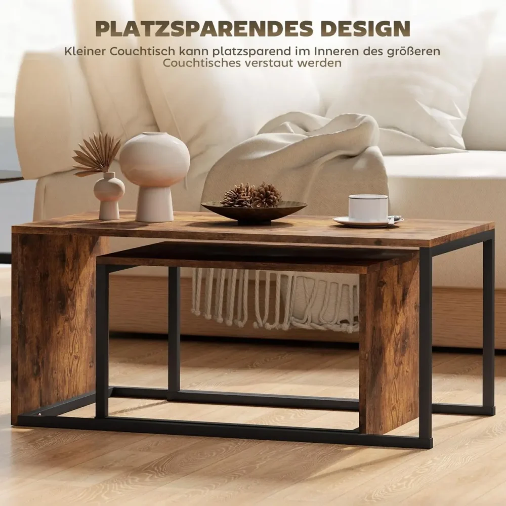 Bli först med att recensera ”Soffbord set om 2 – Satsbord i Industriell Design för Vardagsrum – Sidobord i Svart och Brunt – 90x48x42 cm & 59x42x36 cm”